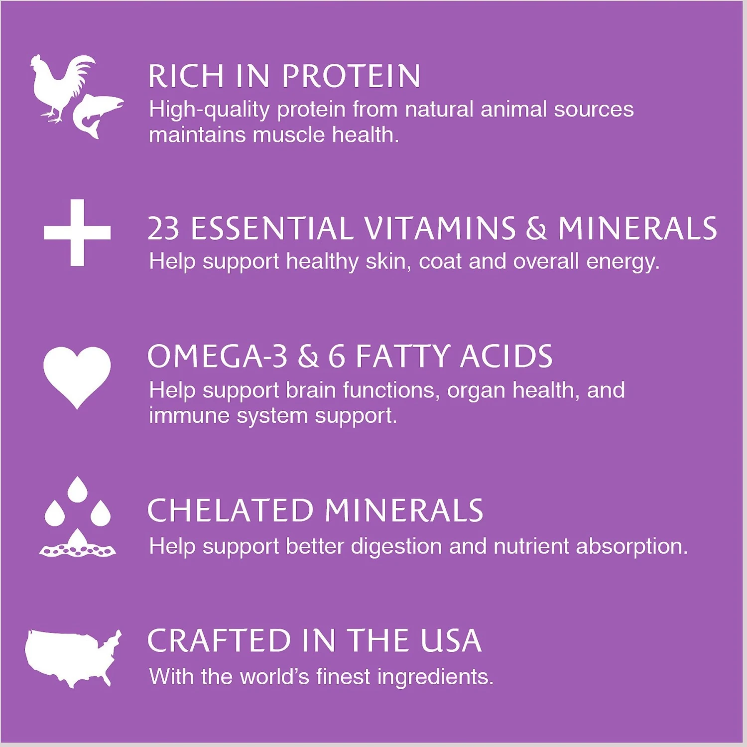- Features protein from natural animal sources to help fuel muscles.