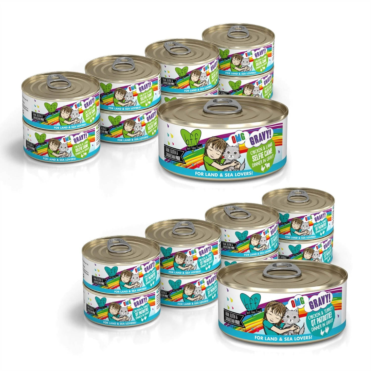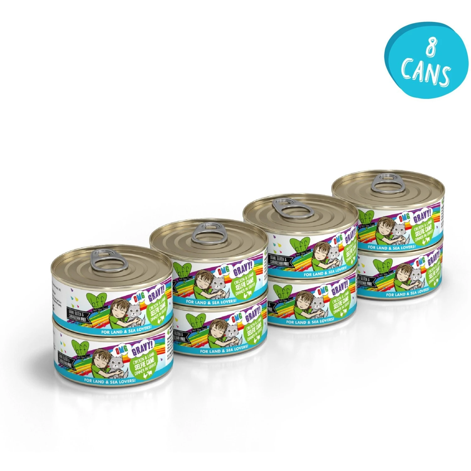 BFF OMG Selfie Cam! Chicken & Lamb Dinner in Gravy Grain-Free Canned Cat Food, 5.5-oz, case of 8—Turn meal time into yum time for your best feline friend with the BFF OMG Selfie Cam! Chicken & Lamb Dinner in Gravy Grain-Free Canned Cat Food. Made with chicken broth, chicken, lamb and tuna as the top ingredients, plus essential vitamins and minerals, it provides a gravylicious and balanced diet for adult kitties. Since it’s packed with broth, it’s a great way to add much-needed hydration to keep your pal healthy. Plus, it’s made with sustainably sourced ingredients in state of the art food facilities with nothing artificial.