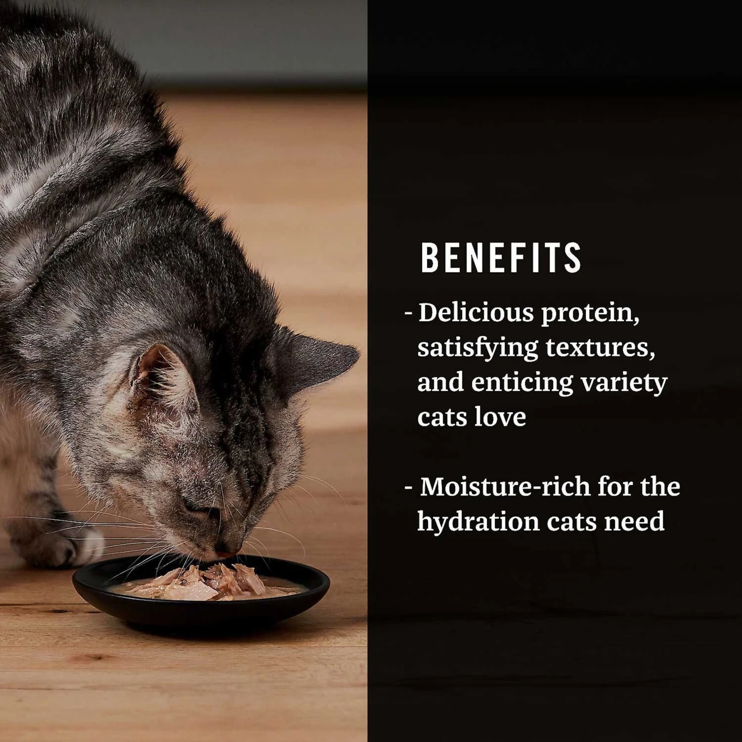 Indulge your cat with savory seafood from Fancy Feast Classic Seafood Feast Variety Pack Canned Food + American Journey Landmark Broths Seafood Variety Pack Wet Cat Food Complement Pouches. The Seafood Feast variety pack features a finely ground and delightfully smooth pate texture that will fill your cat’s belly with joy. Added vitamins and minerals offer complete and balanced nutrition, making every mealtime a nutritious and delicious occasion. Landmark Broths are a tasty, flavor-boosting topper purr-fect for everyday meals or as a special, satisfying treat. No matter how you serve them, your cat is bound to love the craveable seafood proteins in this variety pack—including salmon, tuna, anchovies, shrimp and whitefish. Plus, they’ll also get a boost of hydration to help keep them happy and healthy.