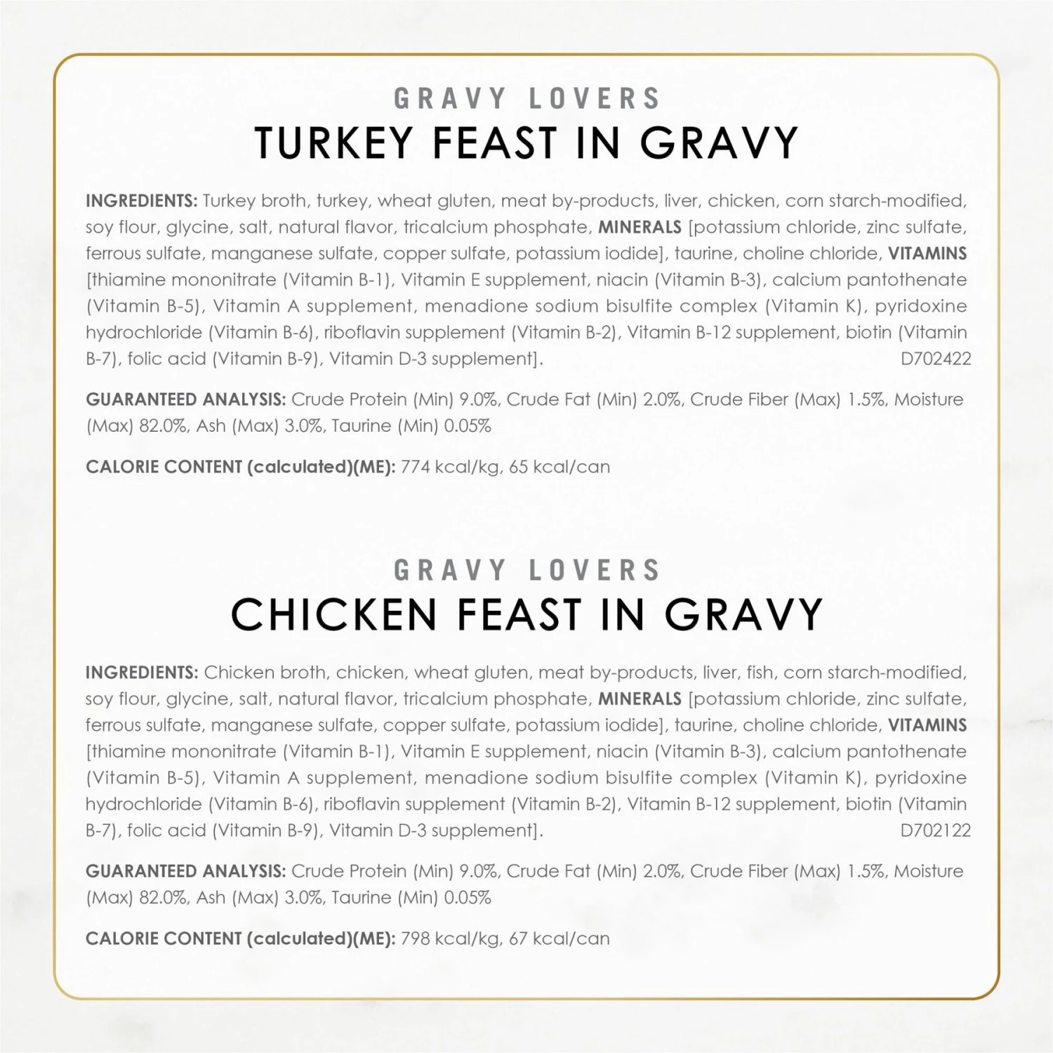 - This irresistible, protein-rich Gravy Lovers variety pack offers gourmet meals with enticing aromas in a light, savory cat food gravy.