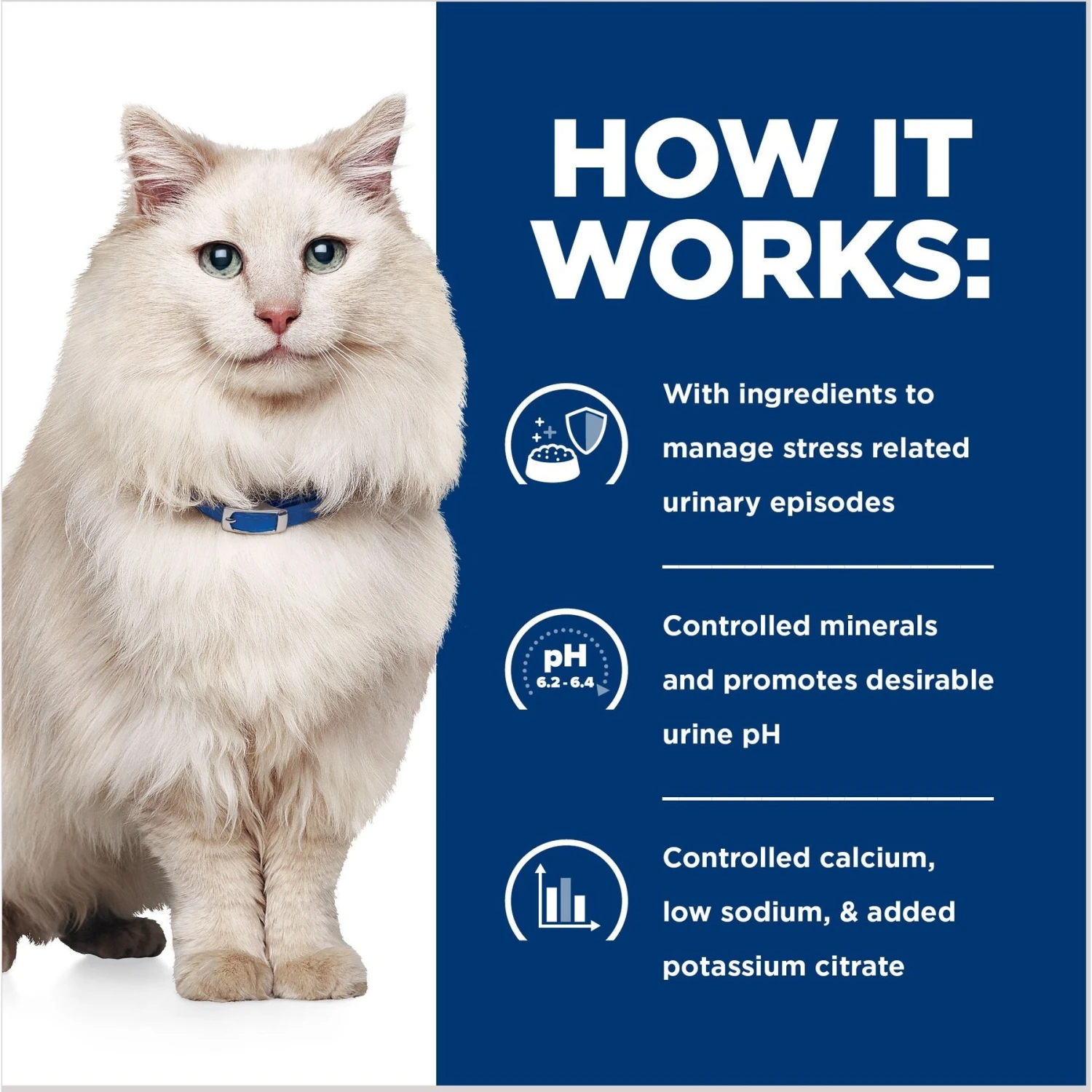 - Clinical nutrition specially formulated to support your cat’s urinary health, while also managing stress for lifelong feeding of adult cats.