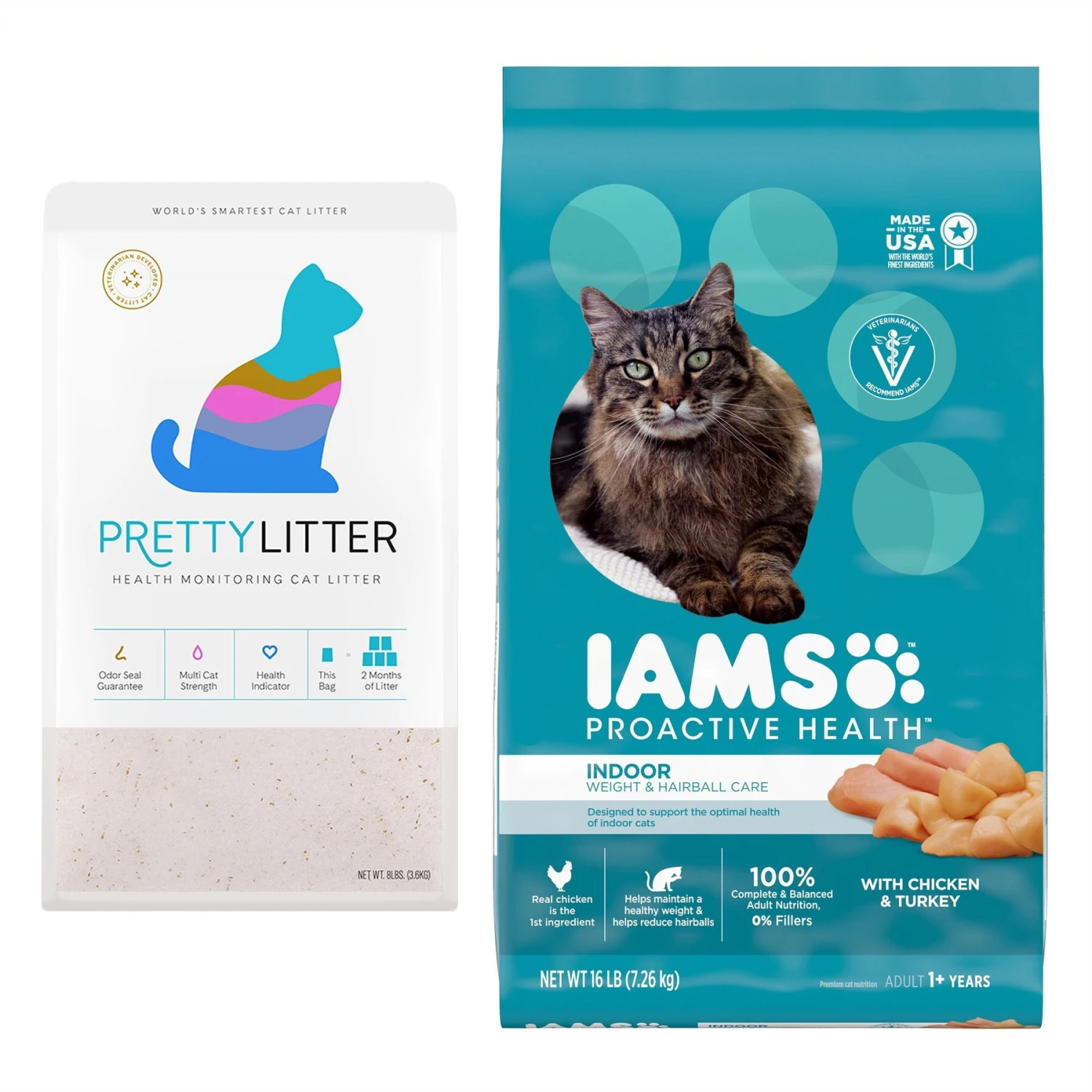 Iams ProActive Health Indoor Weight & Hairball Care Adult Dry Cat Food & PrettyLitter Health Monitoring Cat Litter