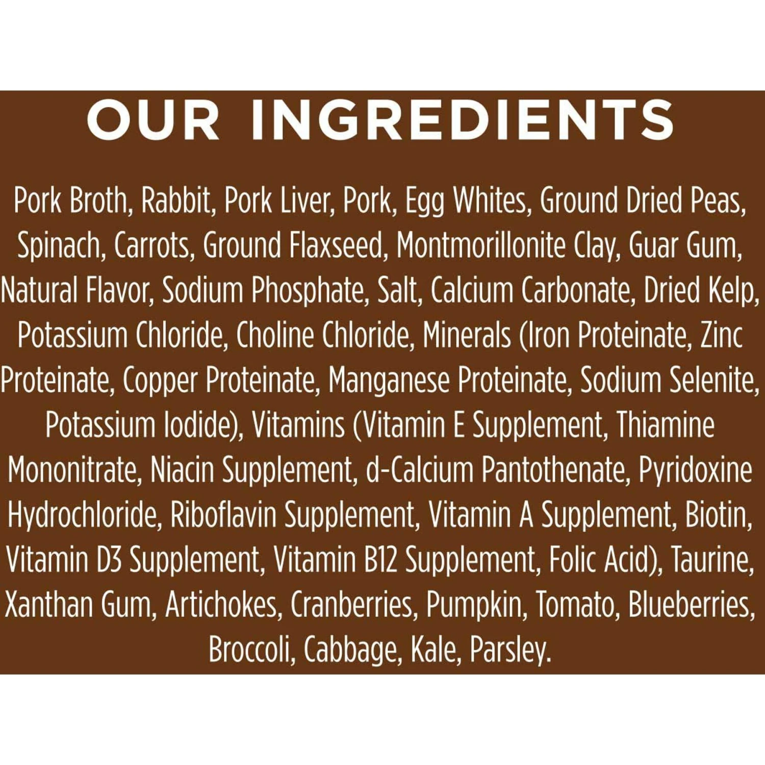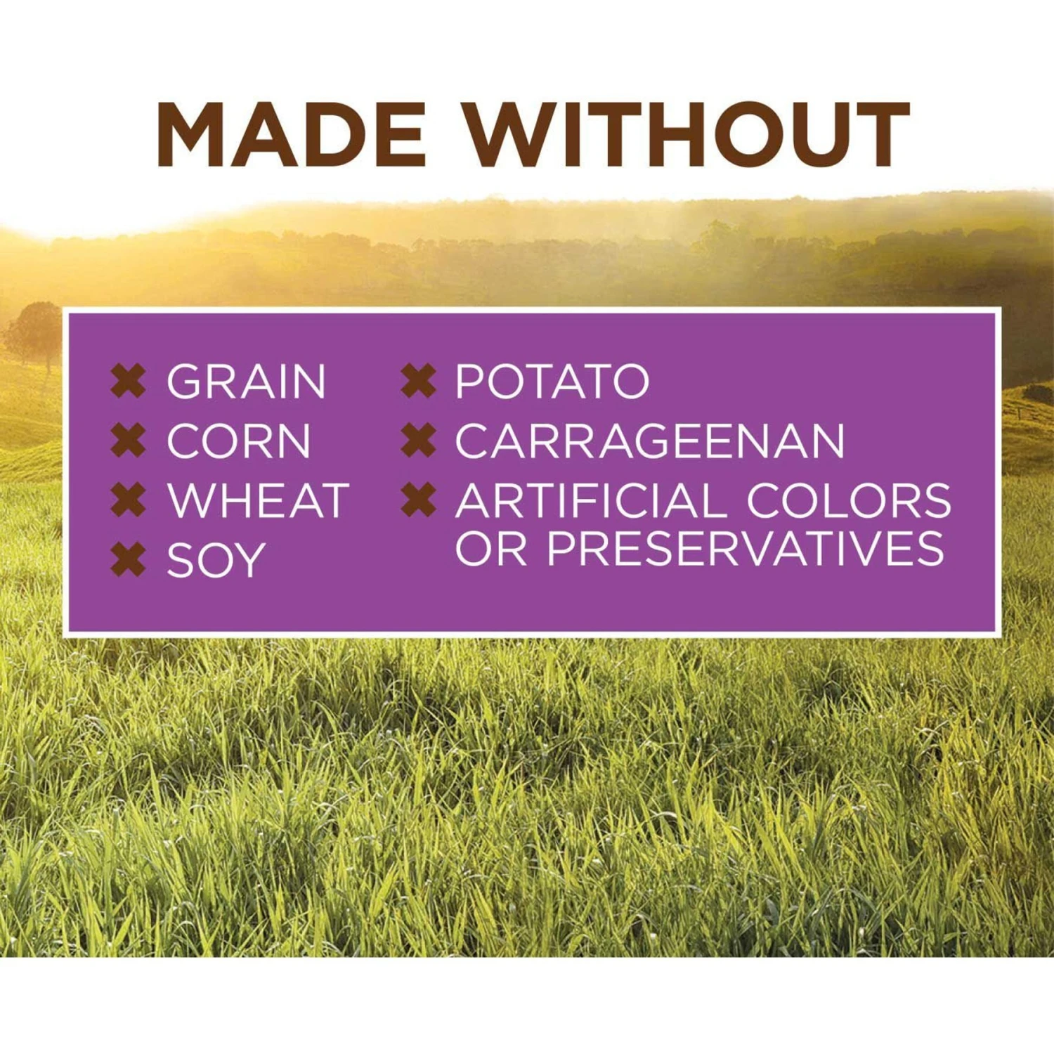 - Never contains any grain, potato, corn, wheat, soy, by-product meal or artificial colors or preservatives.
