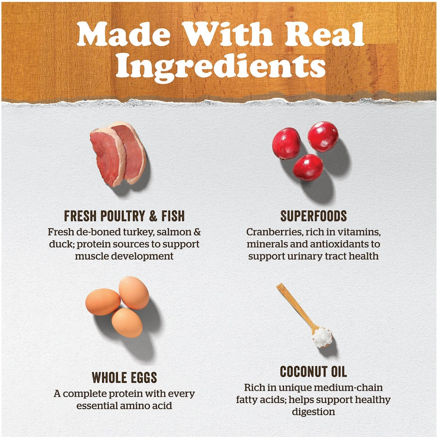 - Made with 20+ natural superfoods, including antioxidant- and fiber-rich cranberries to support urinary tract health and digestion. Whole eggs are also included and are a complete protein with all the essential amino acids your pet needs.