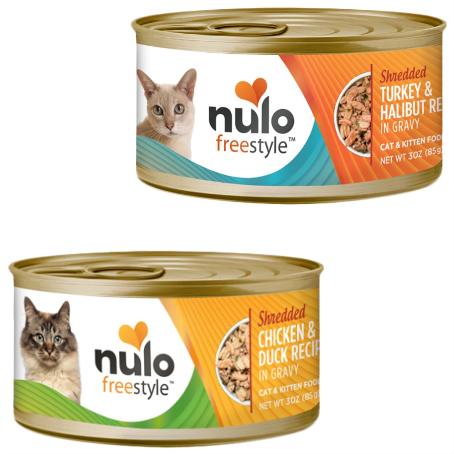 Nulo Freestyle Shredded Chicken & Duck In Gravy Grain-Free Canned Cat Food & Nulo Freestyle Shredded Turkey & Halibut In Gravy Grain-Free Canned Cat Food