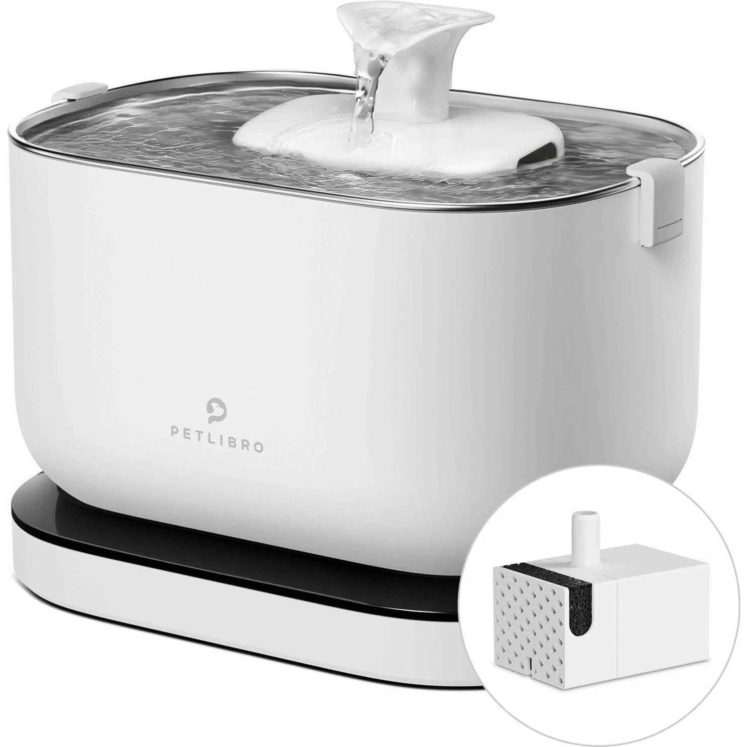 PETLIBRO Dockstream Battery-Operated Water Fountain; Power Adapter; Wireless Water Pump; Tank Base; Filter; Cleaning Brush; User Manual