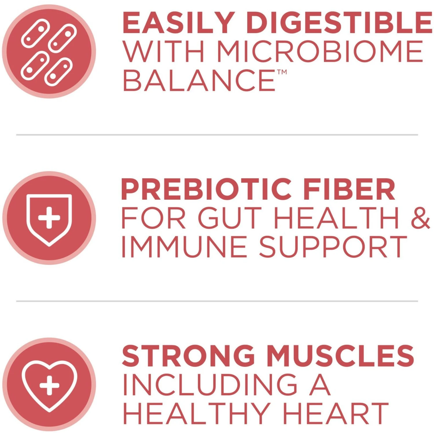 - This easily digestible adult cat food helps support a microbiome balance in your feline friend and is made with natural prebiotic fiber to promote her gut health and immune support.