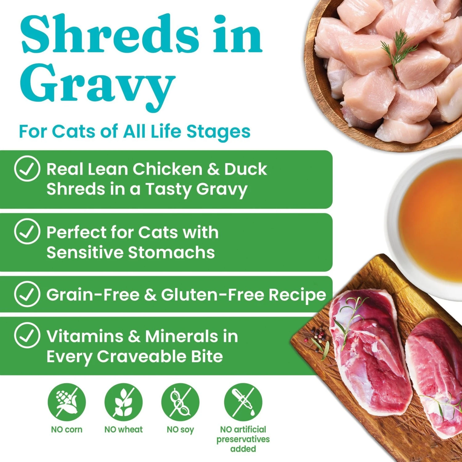 - Solid Gold Nature’s Harmony Shreds in Gravy is a grain- and gluten-free cat food made with whisker-licking chicken broth, lean chicken and duck.