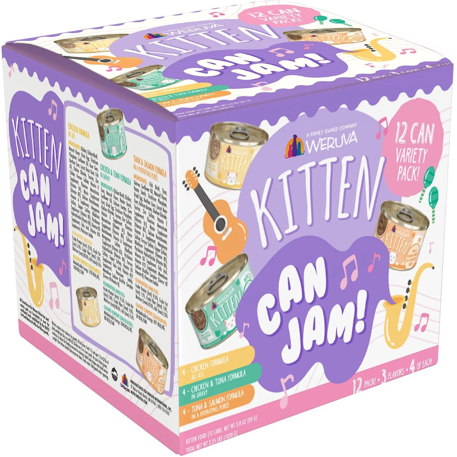 - The Kitten Can Jam variety pack features three yummy recipes—Chicken Au Jus, Chicken & Tuna in Gravy and Tuna & Salmon in a Hydrating Puree.